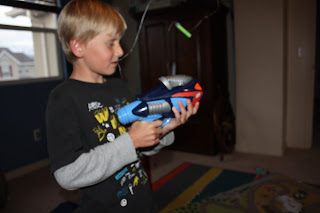 Beckham has a loose front tooth. He has been wanting to tie a string around it and hook it to a dart that would shoot out of the gun. We made a few attempts but the tooth is still in his mouth. Now with a string tied tightly around it. Proud of his courage to try this out. Funny boy.